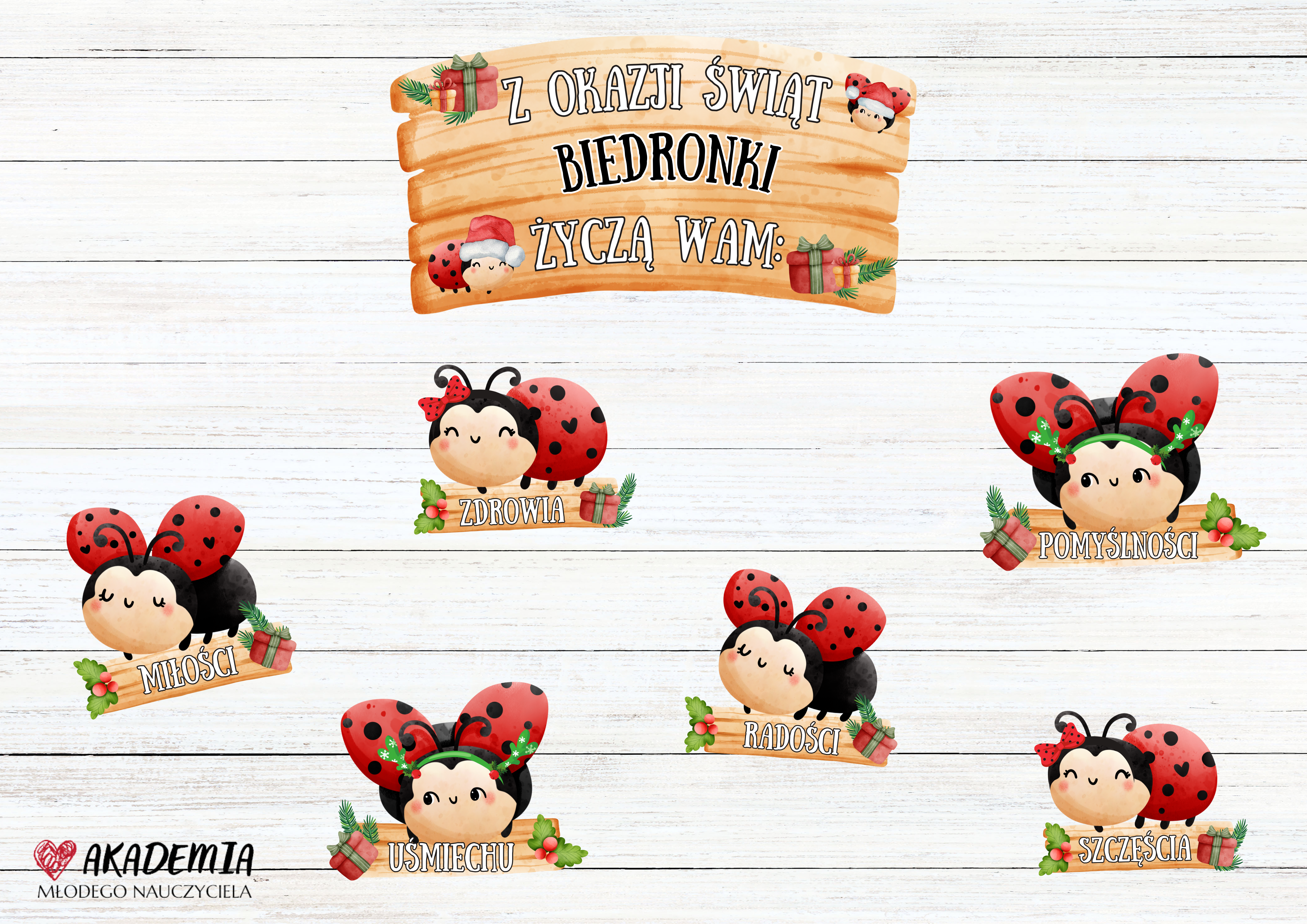 – tabliczka z napisem: “Z OKAZJI ŚWIĄT BIEDRONKI ŻYCZĄ WAM:” w dwóch rozmiarach: A4 i 2 x A4