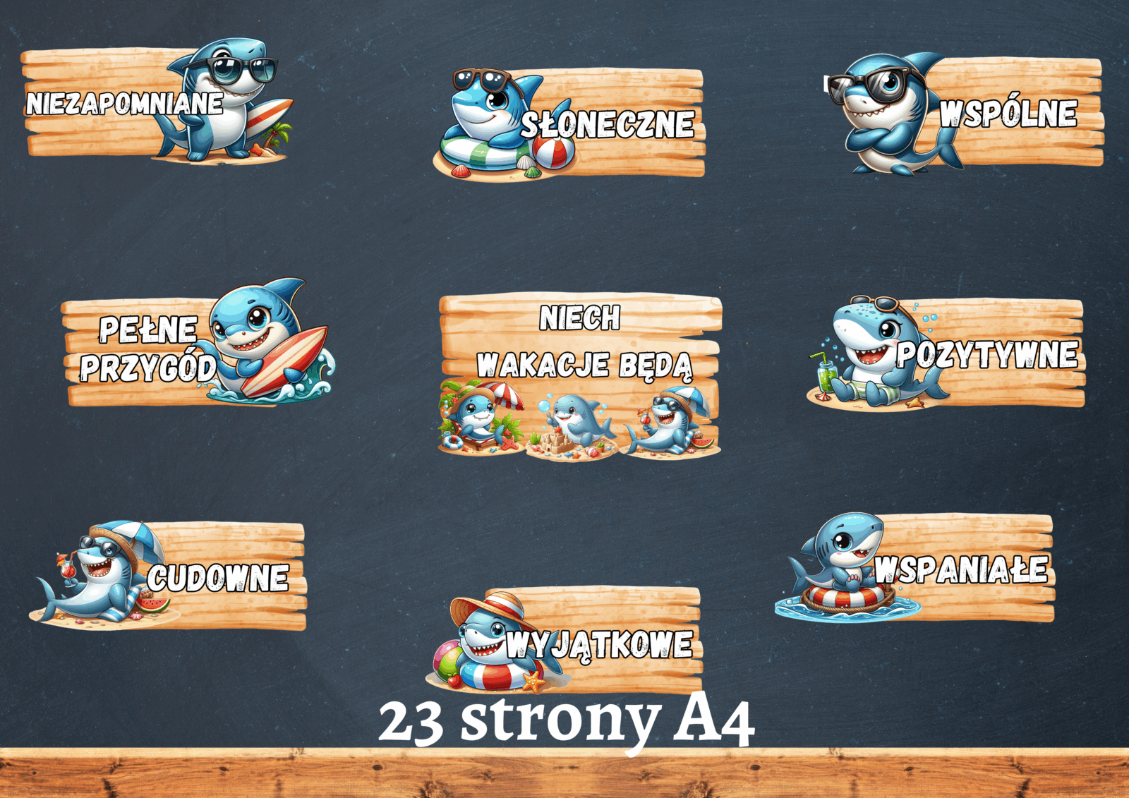 – jedna grafika (tabliczka z napisem i rekinami) na A4,