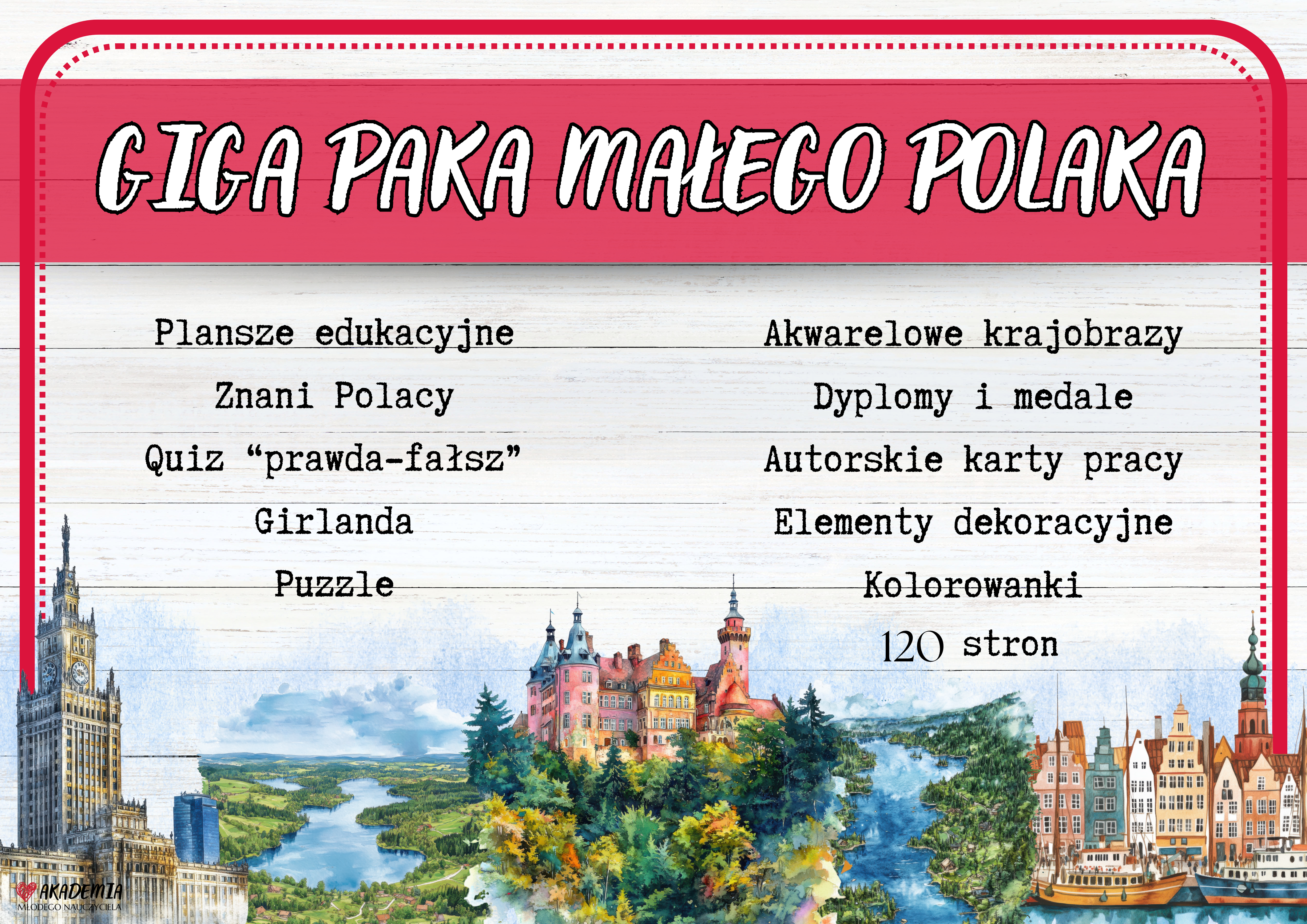 Nasz zestaw edukacyjny to kompleksowa pomoc dydaktyczna, która wspiera nauczycieli przedszkoli i klas 1-3 w codziennej pracy z dziećmi. Dzięki 120 stronom kreatywnych materiałów dzieci będą mogły rozwijać swoje umiejętności w różnych dziedzinach, od historii przez matematykę po sztukę. Kolorowe plansze, quizy, puzzle, a także elementy dekoracyjne i medale sprawią, że zajęcia staną się jeszcze bardziej angażujące i przyjemne. Idealny wybór do wzbogacenia zajęć w przedszkolach, szkołach podstawowych i na lekcjach online!