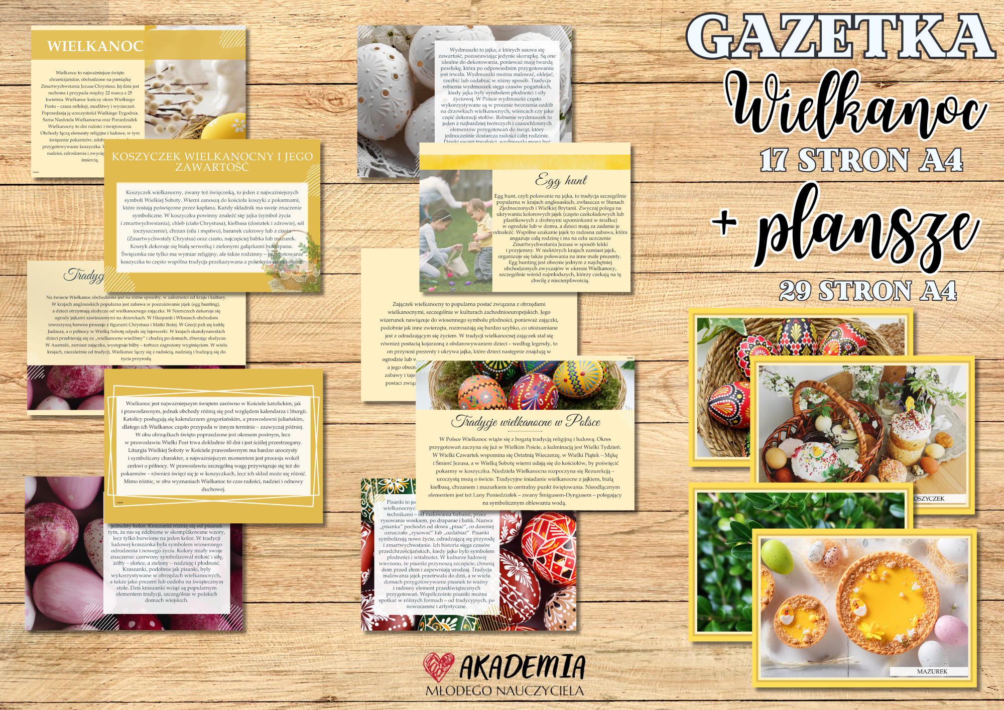 Wielkanoc w tradycji i kolorach – gazetka szkolna i plansze edukacyjne Poznaj zwyczaje i symbole Świąt Wielkanocnych dzięki kolorowej gazetce szkolnej! Barwienie pisanek, tradycje, znaczenie świąt. Gotowe plansze i pomysły na gazetkę klasową. Kompleksowy zestaw materiałów na Wielkanoc.